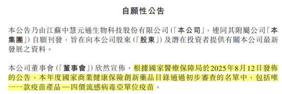 8月13日,中慧生物披露,在国家医疗保障局发布的本年度国家商业健康保险创新药品目录初审名单中,包括唯一一款疫苗产品——四价流感病毒亚单位疫苗。
